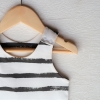 There are two snap fasteners on either shoulder and the dress is designed to be just below the knee for 18 months +. For the smaller sizes we decided to raise the hem slightly to allow for freedom of movement when crawling